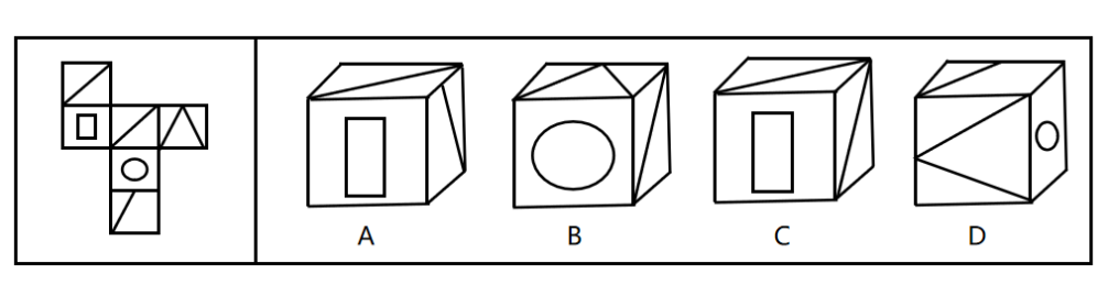 左边给定的是纸盒的外表面,下列能由它折叠而成的是( )。