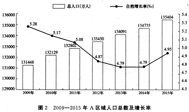 2015年A区域粮食总产量58957万吨,比上年增加1836万吨,增长3.2%。其中,夏粮产量12995万吨,比上年增长2.8%;早稻产量3329万吨,增长1.6%;秋粮产量42633万吨,增长3.5%。2015年末,该区域总人口135404万人,人口自然增长率为4.95‰;出生人口1635万人,人口出生率约为12.1‰。